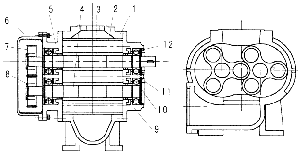 ⑧拆羅茨風(fēng)機前、后墻板時要注意安全,不要將主軸和從軸上的密封碰壞。然后將主動轉(zhuǎn)子和從動轉(zhuǎn)子從機殼取下,拆下來的零件要做好標(biāo)記。